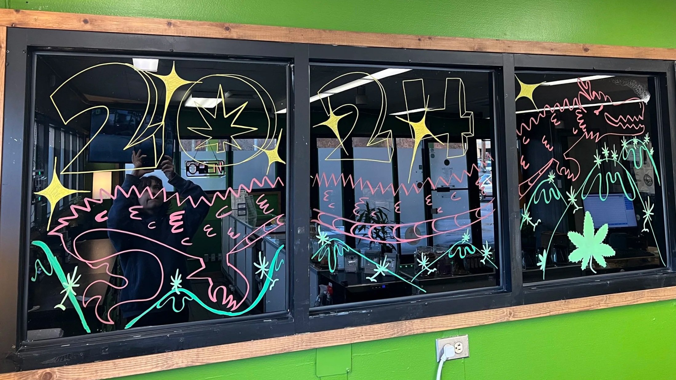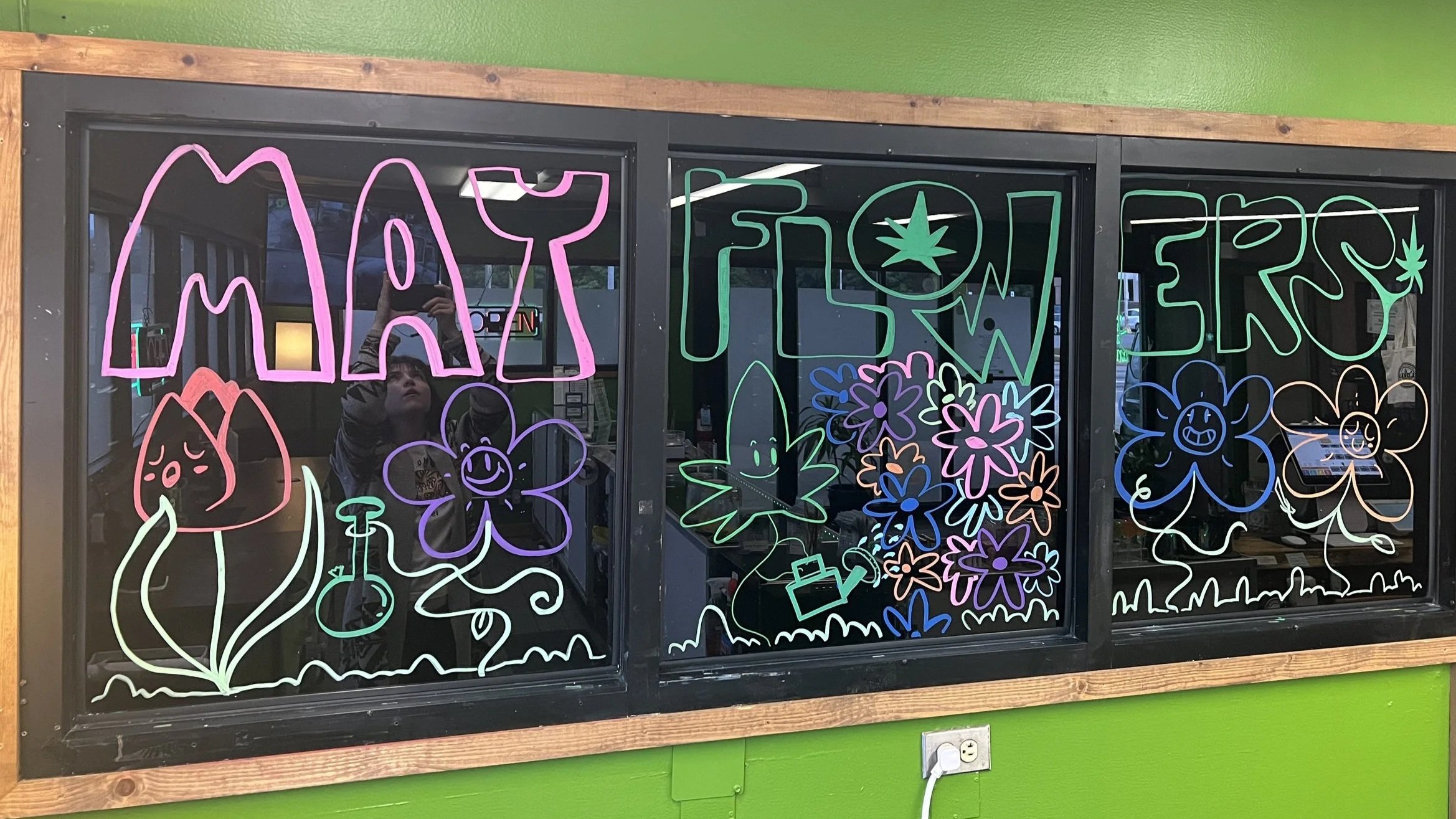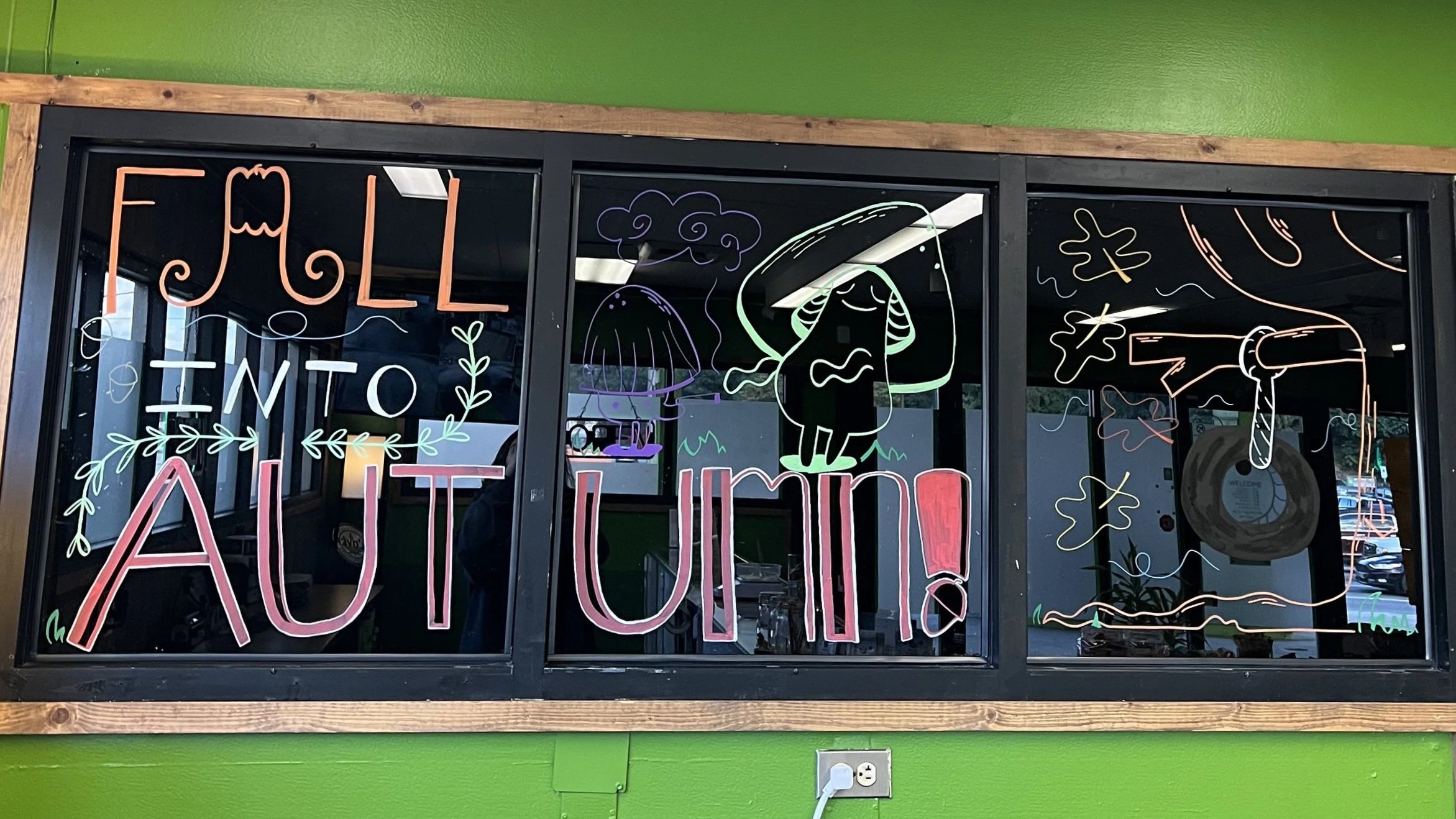 Window mural designs for a local store. Changed monthly, includes April, May, January, and October Murals. Made with Posca paint pens.